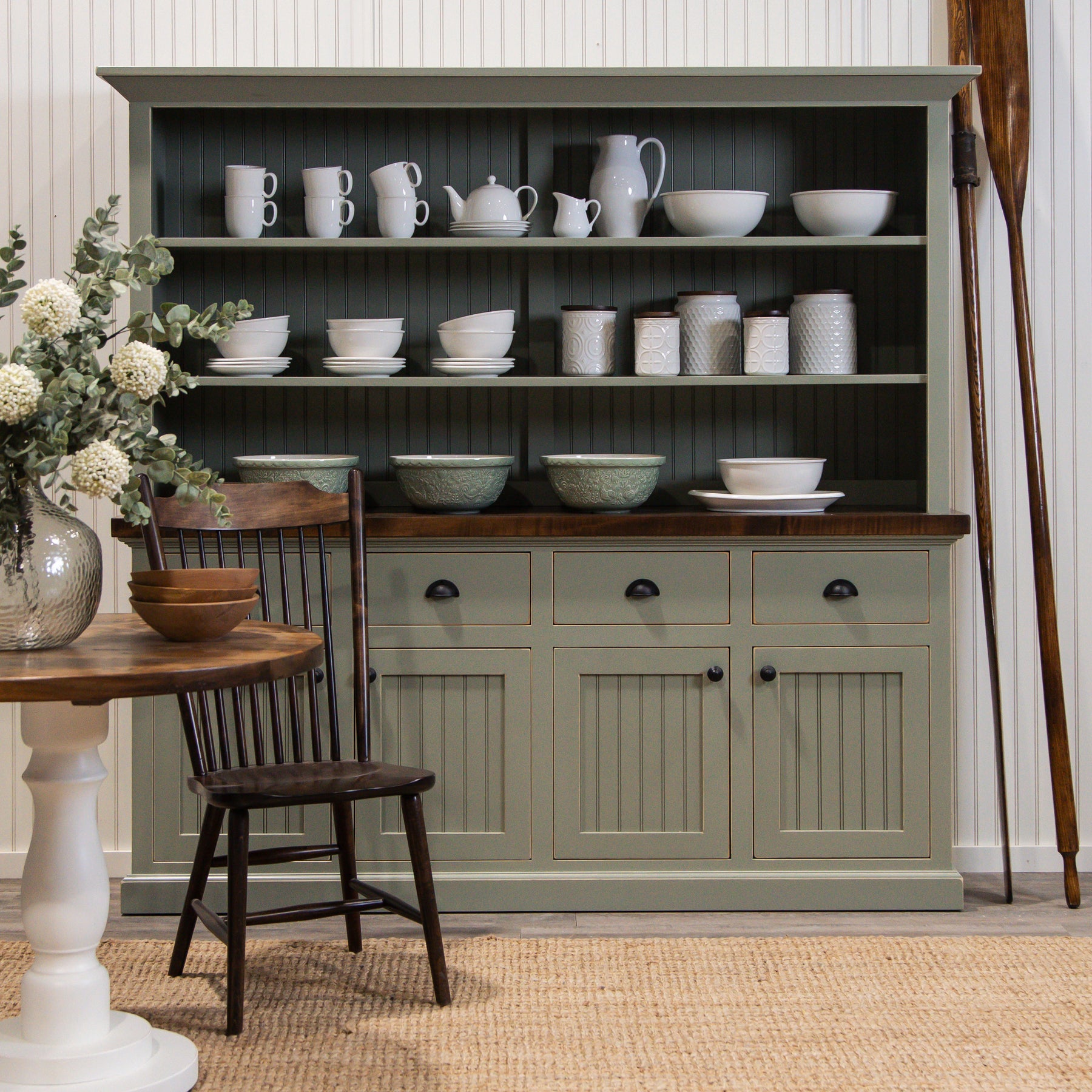 This Ontario-made cabinet with upper hutch is expertly handcrafted from solid brown maple, showcasing timeless craftsmanship and quality materials. Shown in our new Sage paint option.
