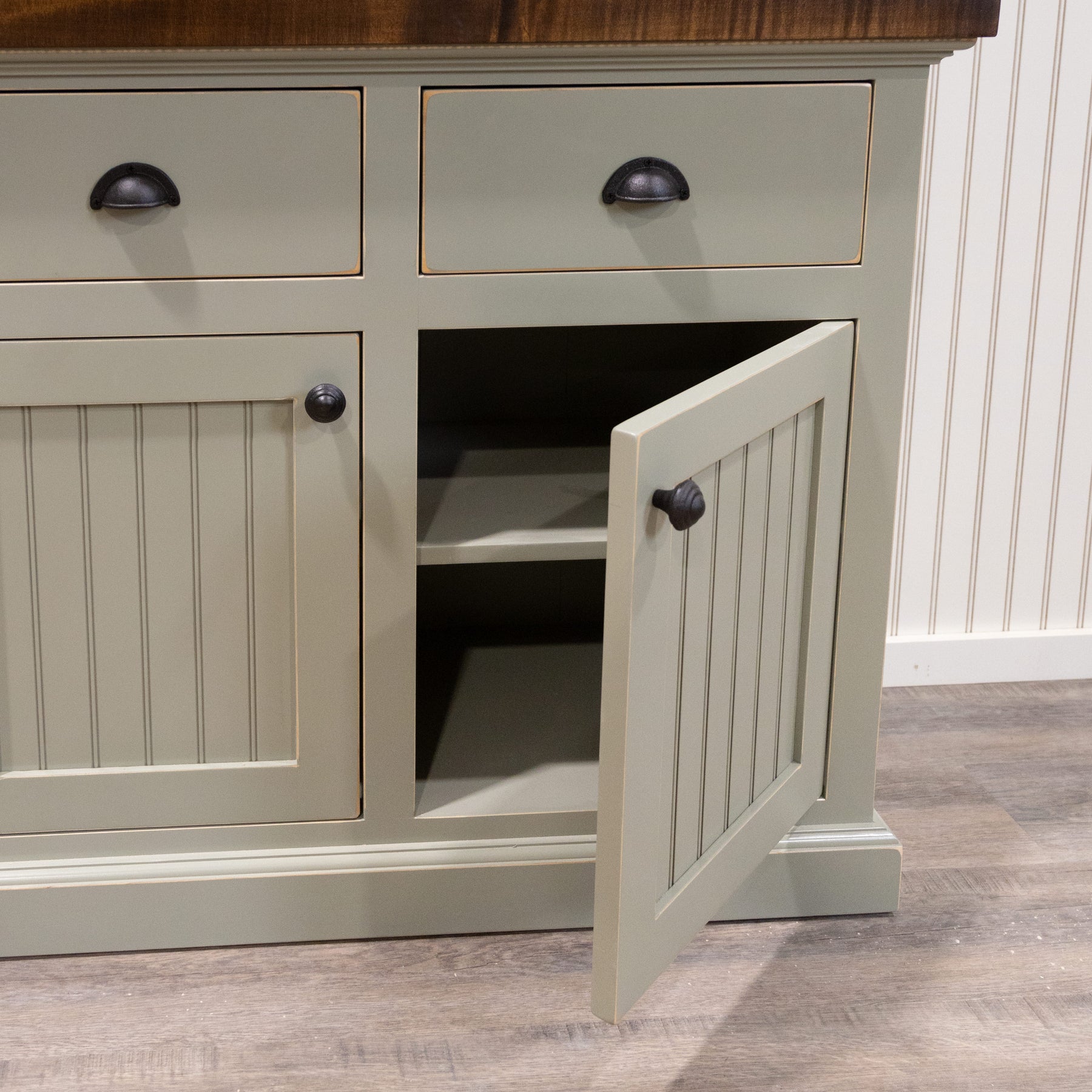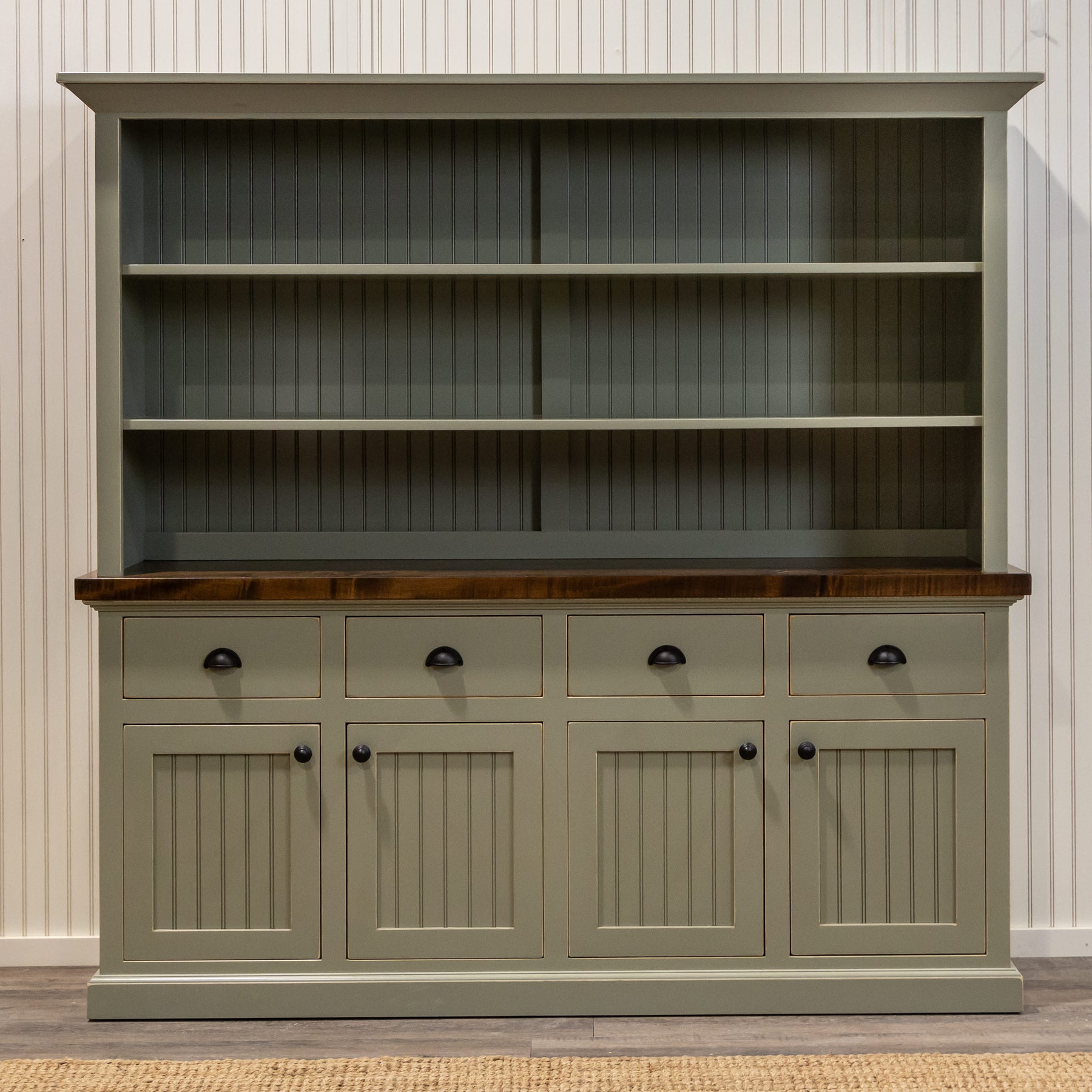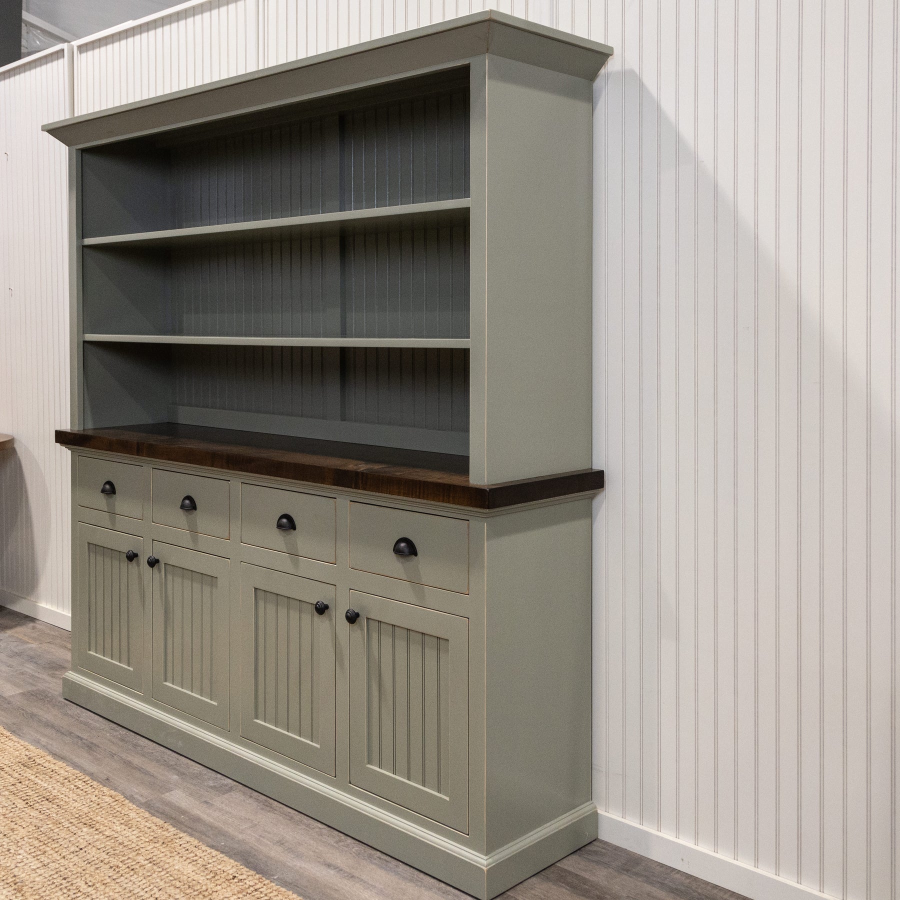 The lower cabinet features four spacious drawers and four doors with classic beadboard door and back panels. Each enclosed section is divided by a stationary shelf for practical storage. The solid maple 1¾" top is available in 10 beautiful stain options, with several base paint colours to choose from. The upper hutch includes two stationary shelves and is finished with a painted crown, adding both function and elegant detail.