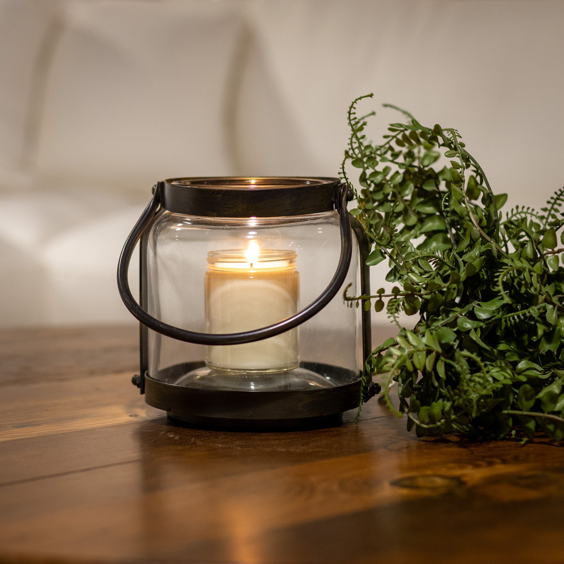Candles whether real or faux, naturally emit a very soft tranquil light. They create a simple comforting ambience within a space. The cheerful flicker of their flame mesmerizes the eye and calms the mind. This is one of our favourite candle lanterns. It is a thick glass jar with an iron base and handle.