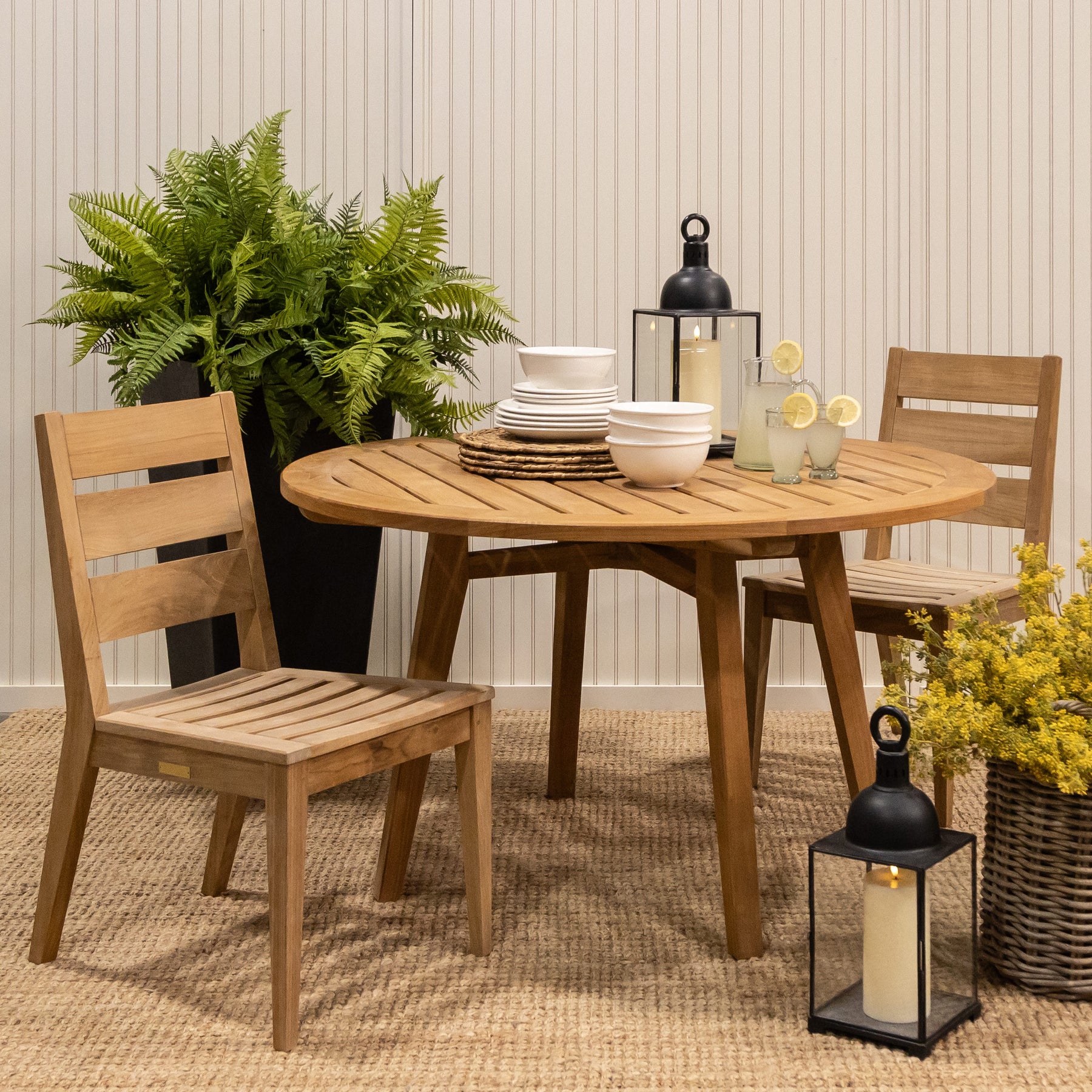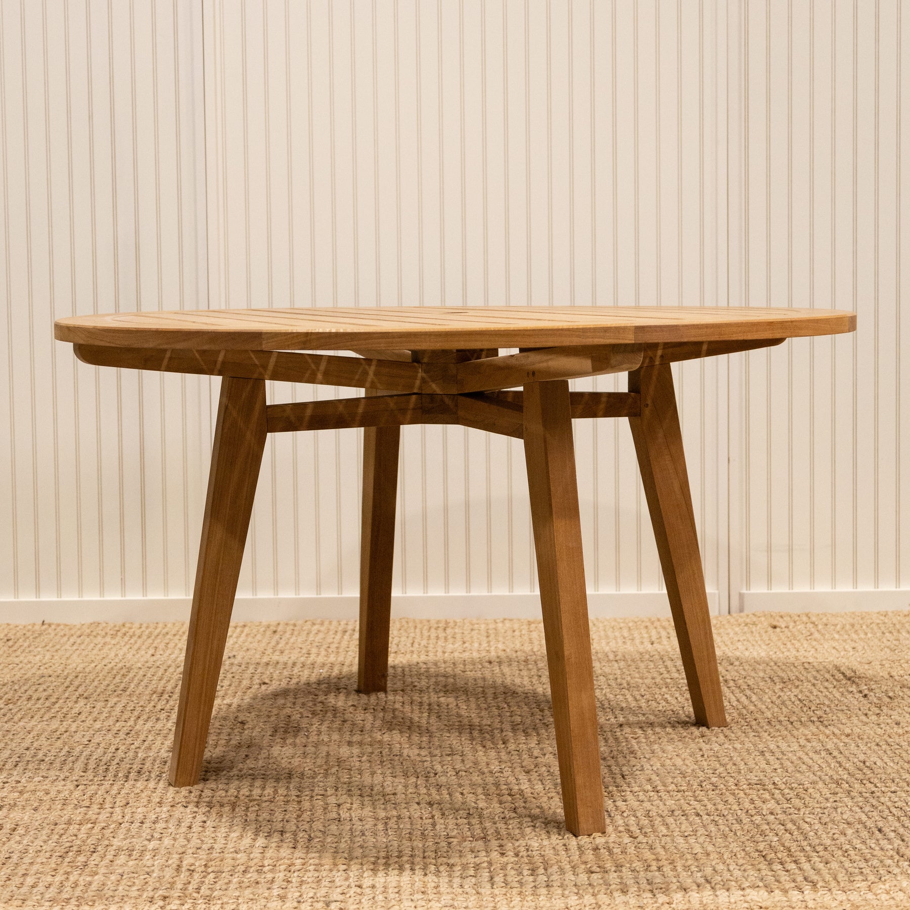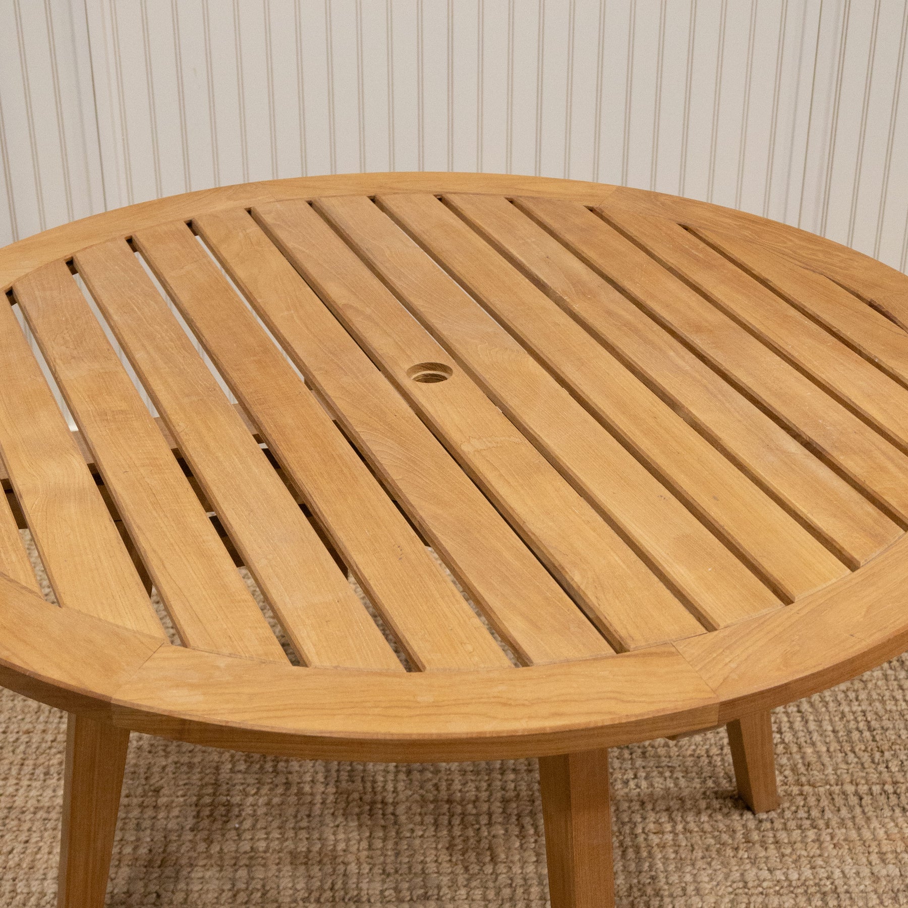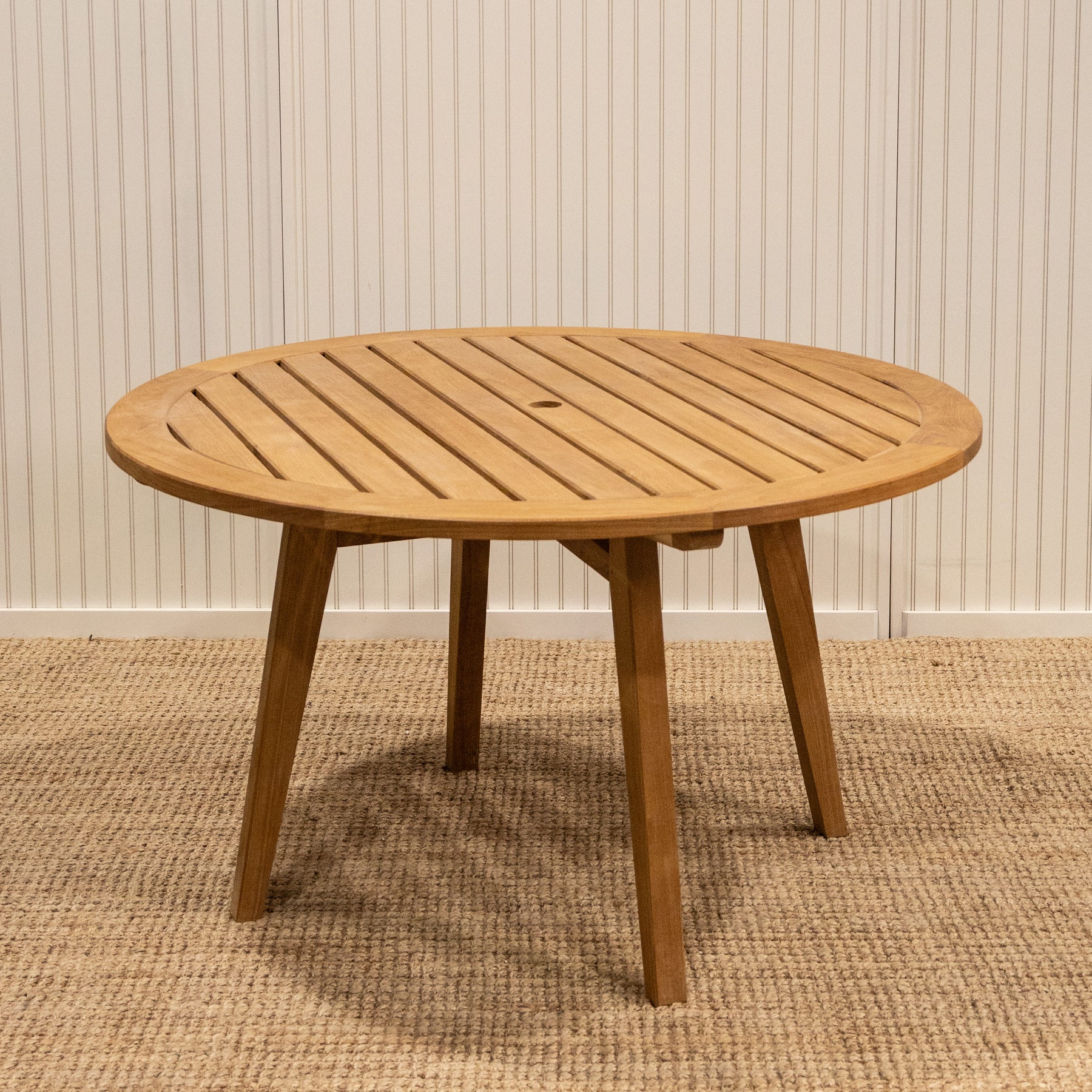 Beautifully crafted with premium solid teak to ensure years of enjoyment. Available in two sizes, 52” and 60” round and can be used indoor or outdoor. Natural weathering will occur overtime and enhances the beauty of the table. Market umbrellas available for both sizes.