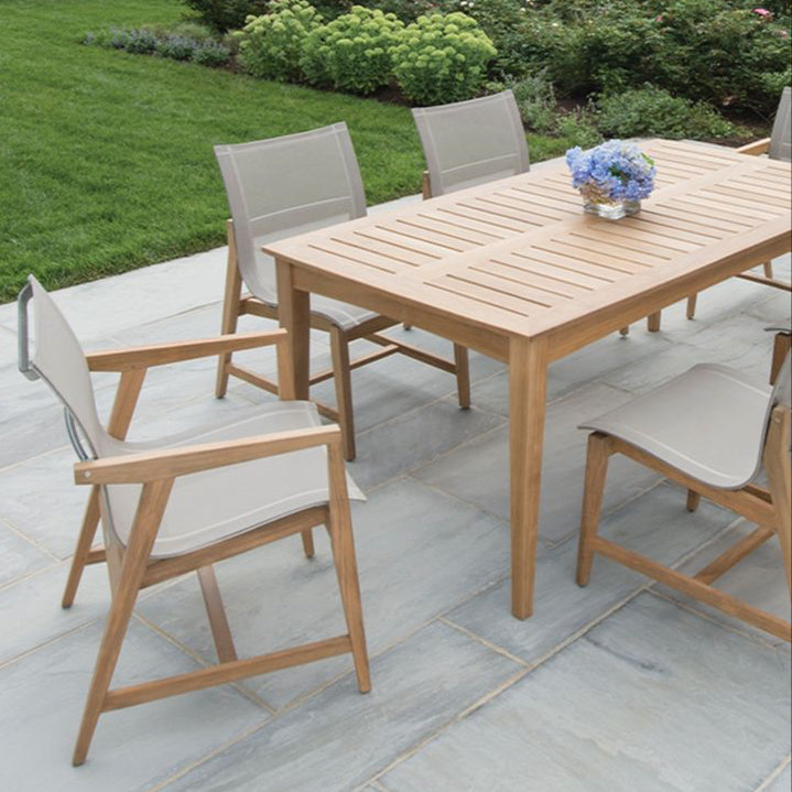 Our popular teak & mesh dining chairs are crafted from solid Grade A teak with a taupe Batyline™ sling seating surface. Comfortable for lingering during a scrumptuous meal or just a friendly verbal gathering. Available in a side chair and arm chair for indoor and outdoor use. Natural weathering will occur overtime and enhances the beauty of the chair.