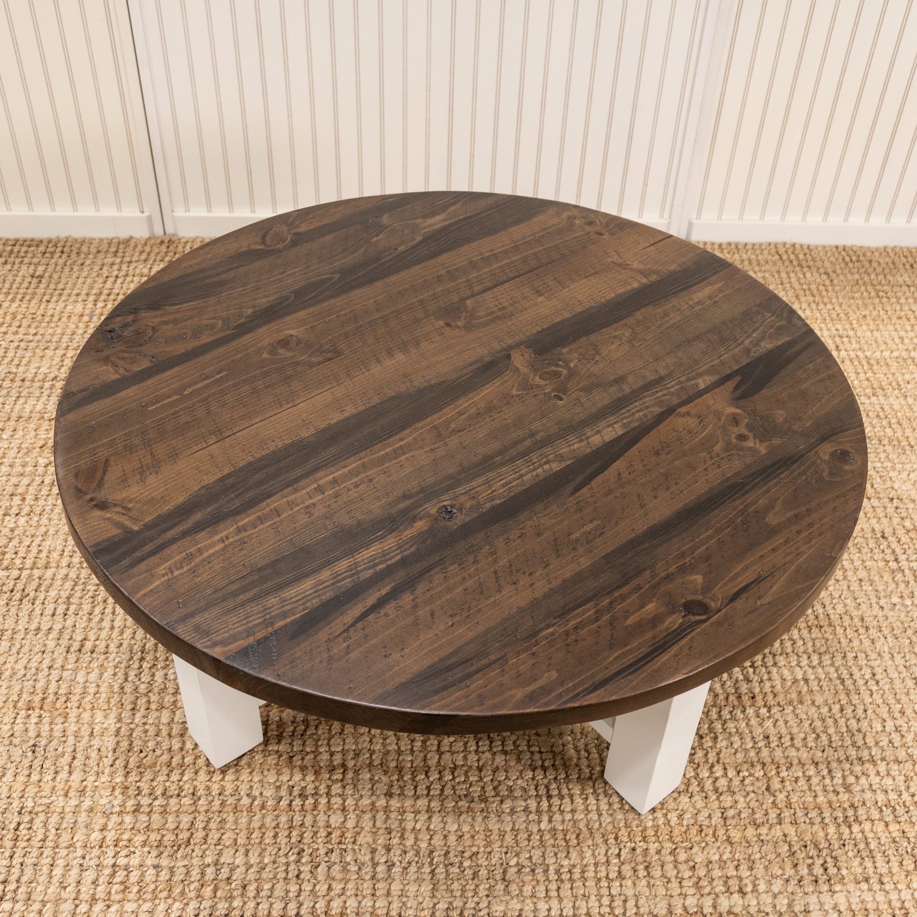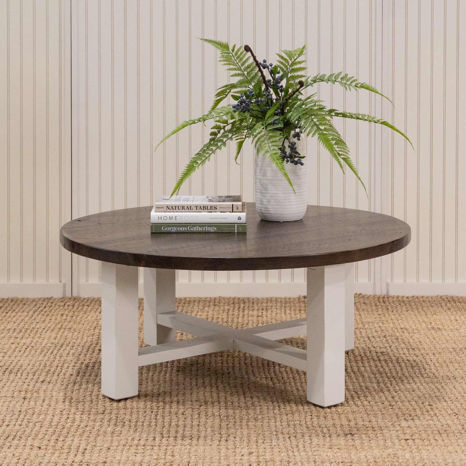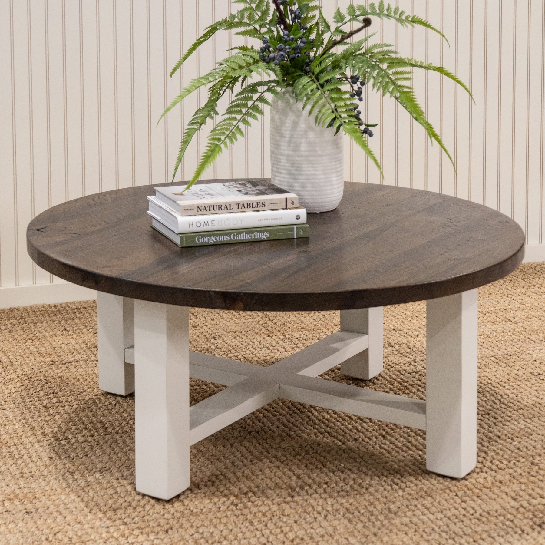 This handcrafted cross base table embodies a timeless lake house vibe. Made for us in Ontario, it is shown with painted base and old barn wood top which brings out the natural patina of the wood.