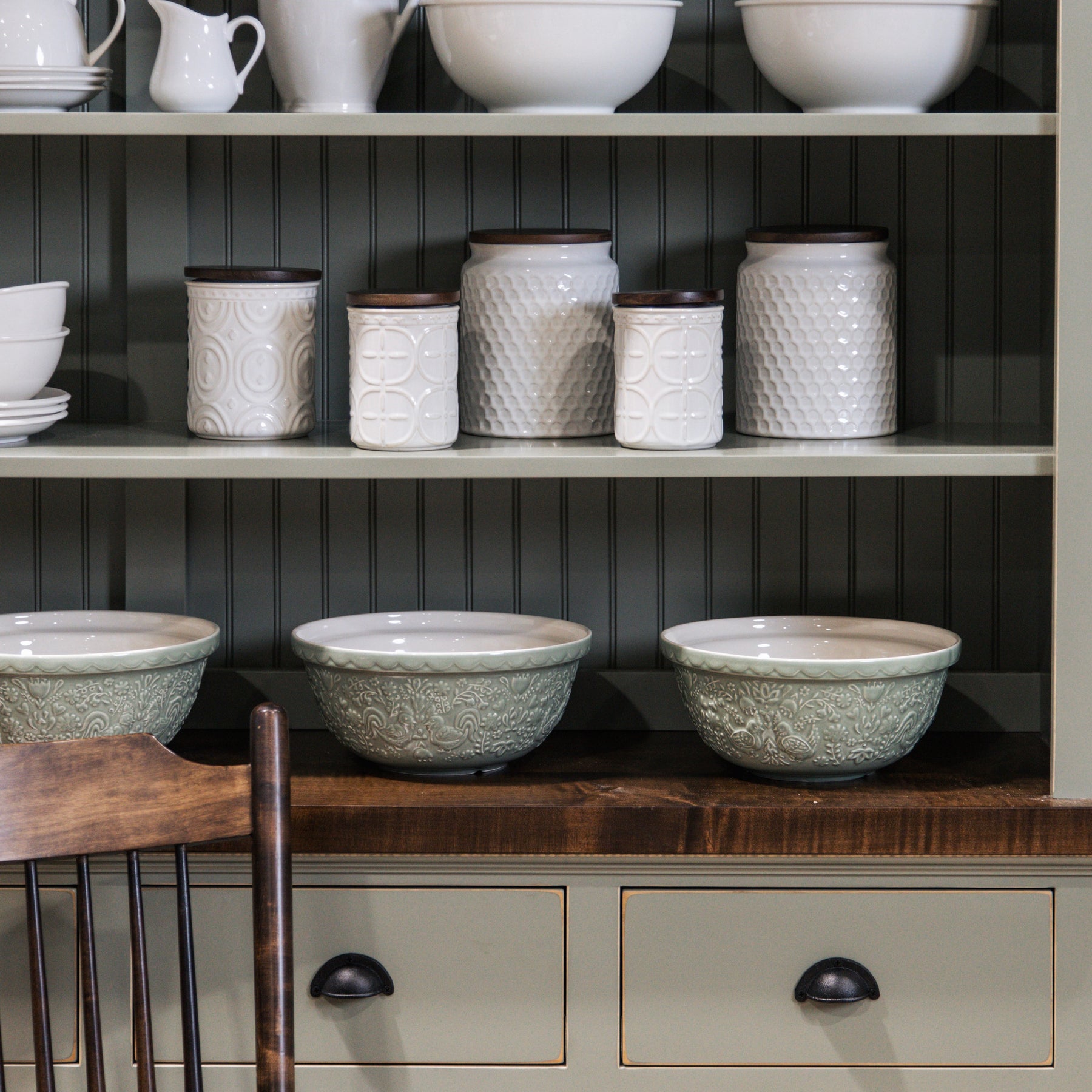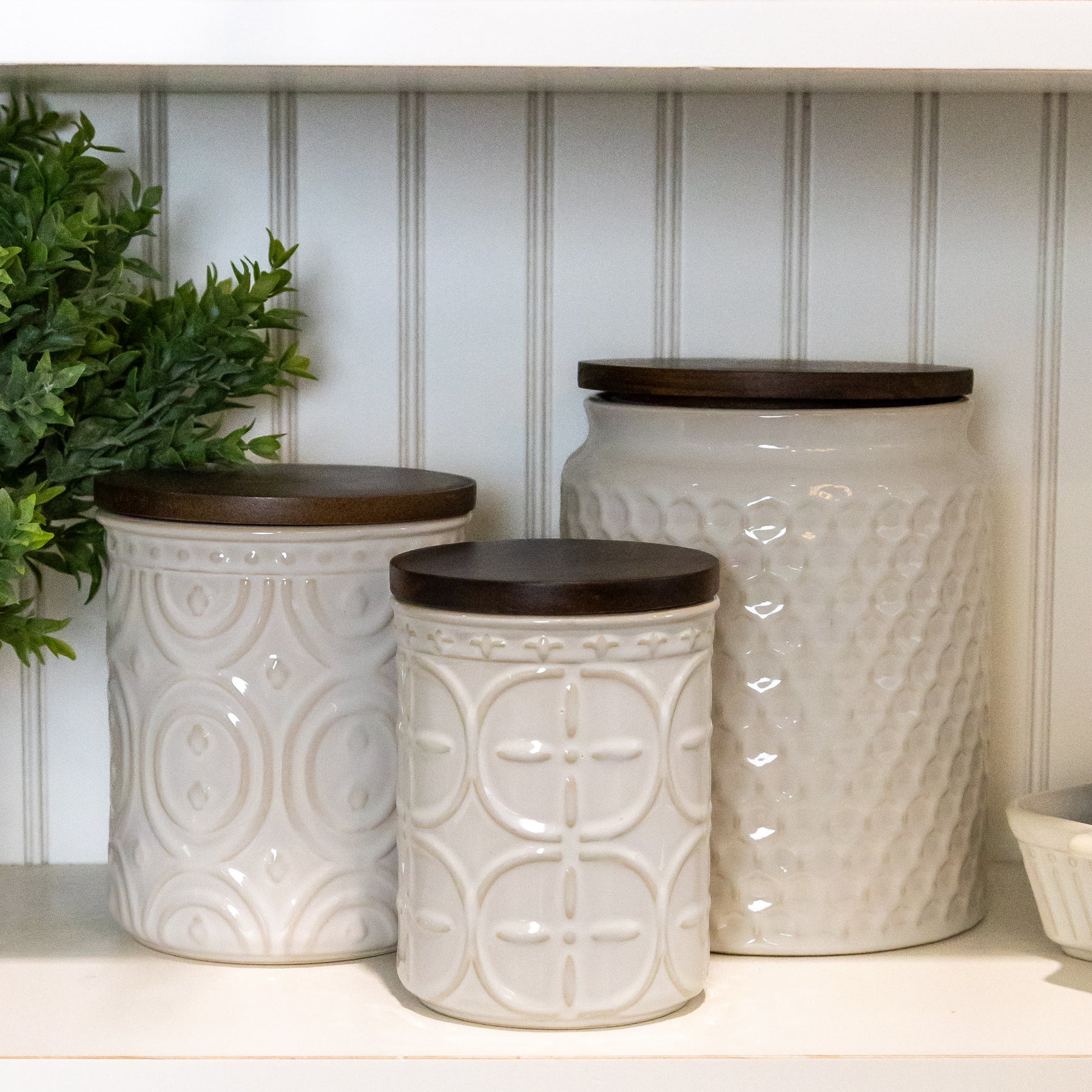 A beautifully embossed ceramic canister featuring a soft pattern, topped with a smooth wooden lid that adds warmth and natural charm. Its clean white finish and textured detailing make it an elegant yet functional piece—perfect for storing pantry staples or adding a decorative touch to your kitchen counter.