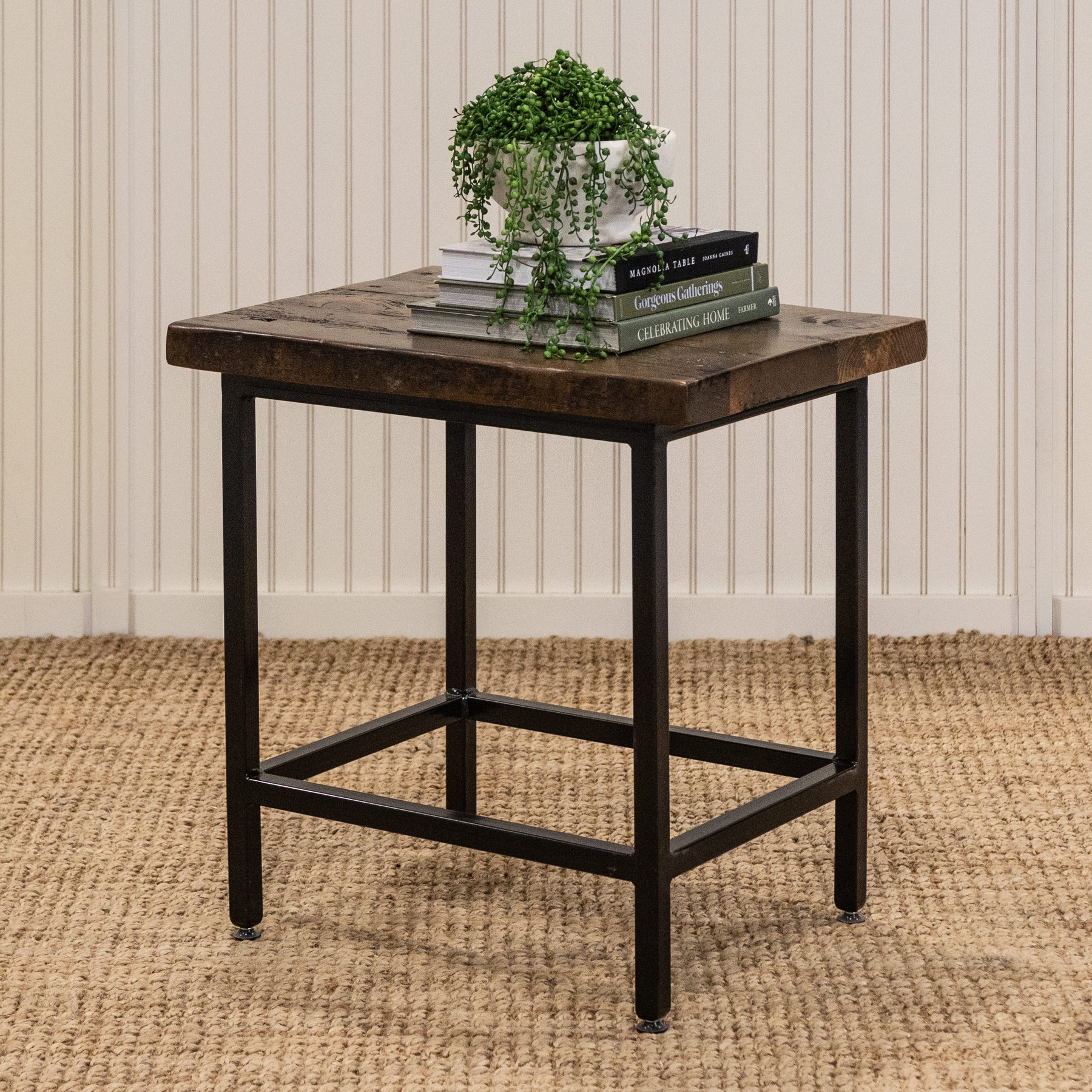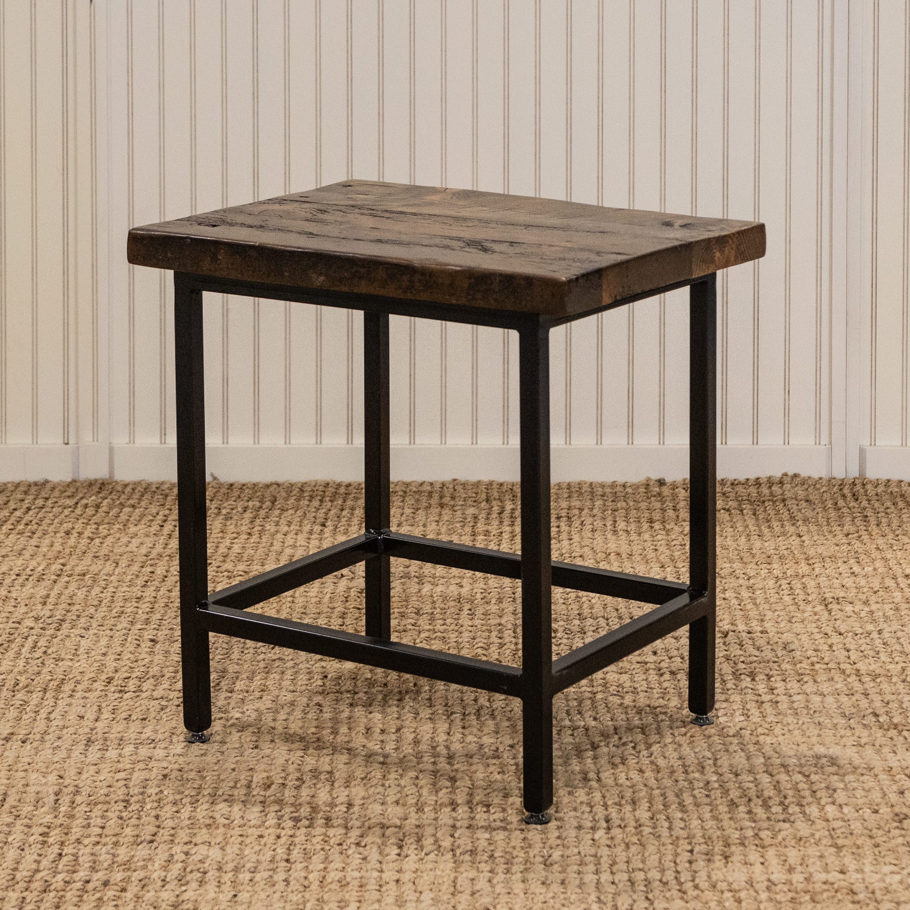 The straight metal base of this side table combined with an old barn wood top works equally well in a contemporary cottage, a modern home or a hard loft. The metal base is finished in black and the top is crafted from Reclaimed Barnboard and stained in an Early American. Sawmark pine top also available in Ebony,Dark Walnut, Puritan Pine and Early American stain.
