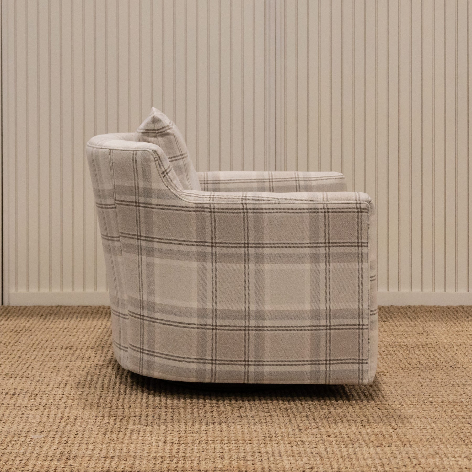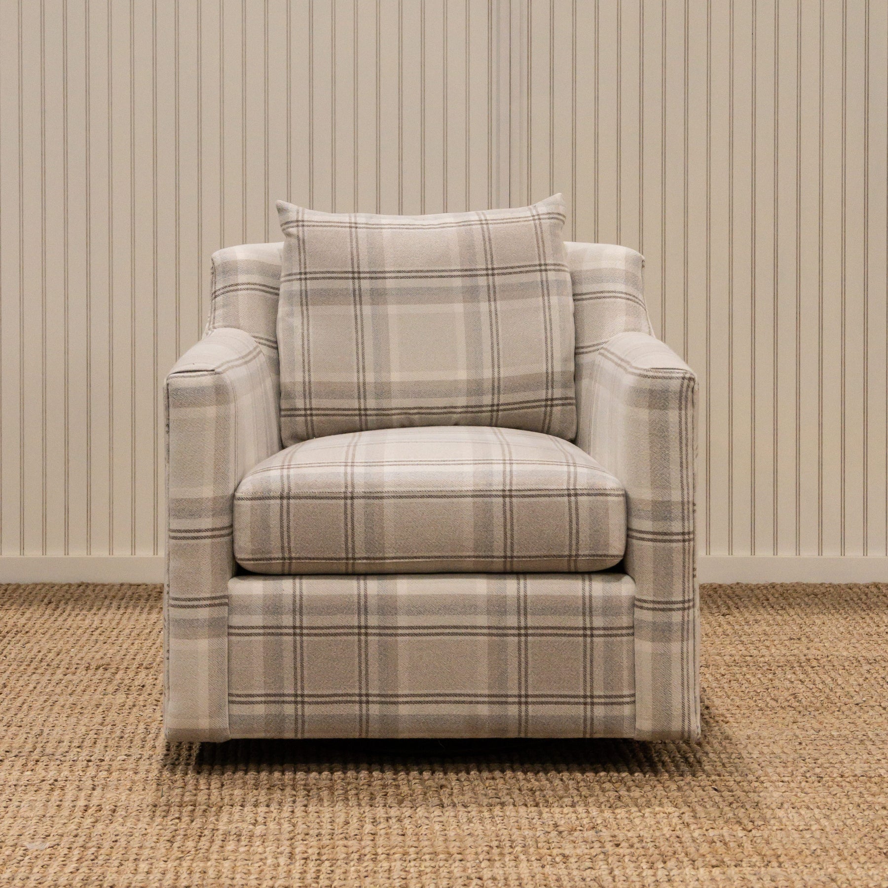Regular price $2,146.00Benchmade in Ontario, the Brook Swivel Chair brings comfort and character to any space. Its gently rounded back and smooth swivel base make it as versatile as it is stylish. Upholstered with standard high-resiliency foam seating, it offers lasting comfort and support. 2 other comfort options available. Finished in a classic tartan fabric, this chair is the perfect accent for both cottage living and the home, blending timeless style with everyday functionality. Available in 100 fabric options.