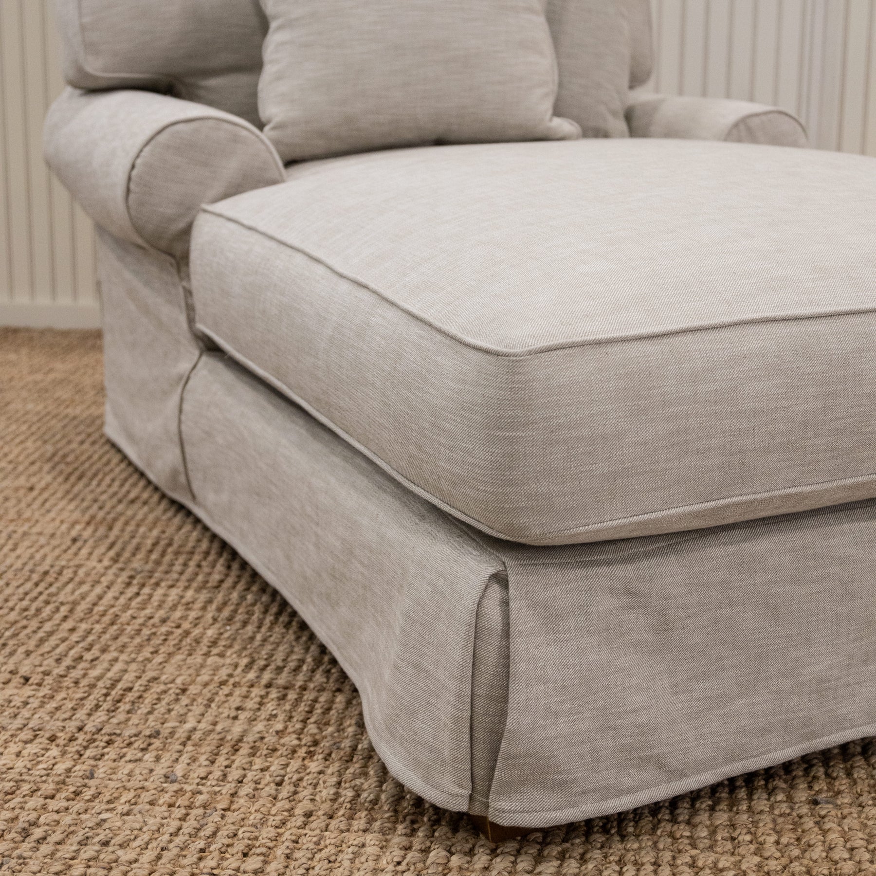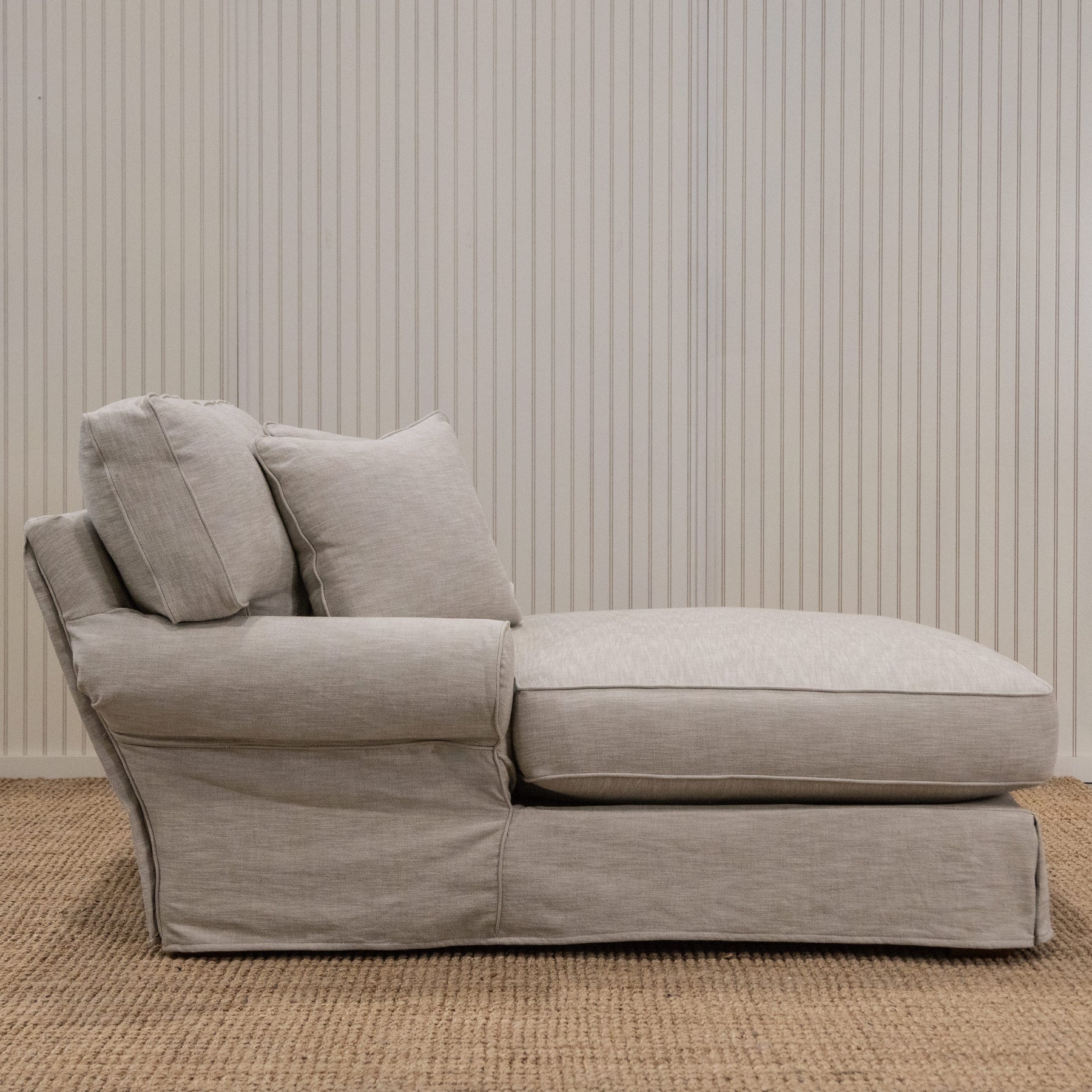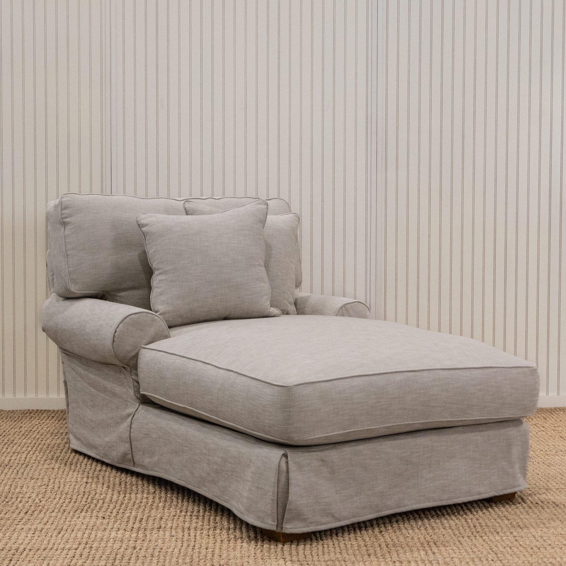 A comfy, casual large profile chaise with our spring down cushion seating, invites you in to sit and linger a while. Softly tailored with a loose-fitting slipcover and unlined skirt, the fabric drapes like your favourite shirt. This slipcovered oversized chaise has a recessed large, rolled arm, loose T shaped seat cushion, loose box back cushion, piped seams and a pleated skirt. Characterized by an 8-way hand tied spring system with our Spring Down seat cushion which offers exceptional comfort and support.
