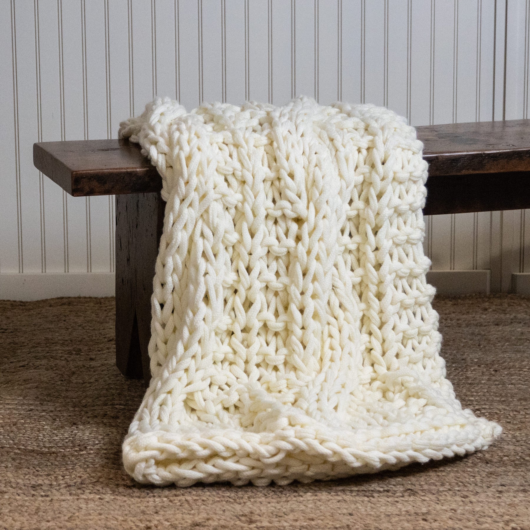 Find warmth in this timeless chunky knit blanket featuring a soft, breathable design handmade for ultimate comfort.